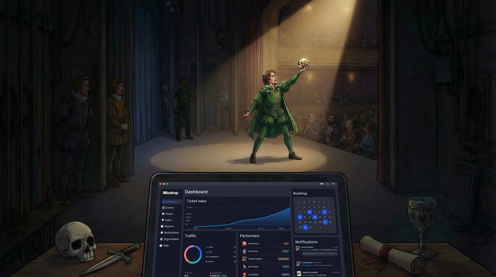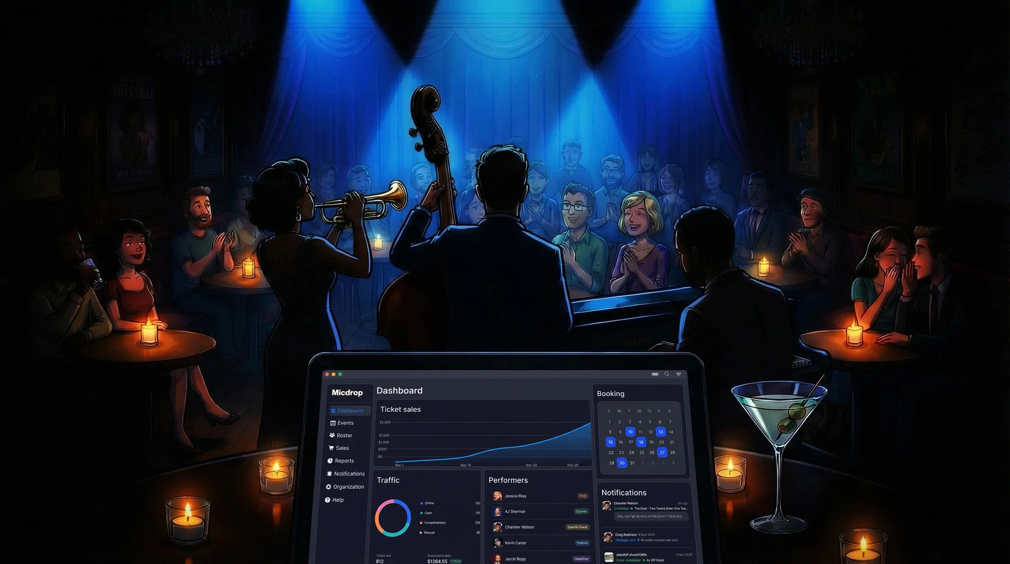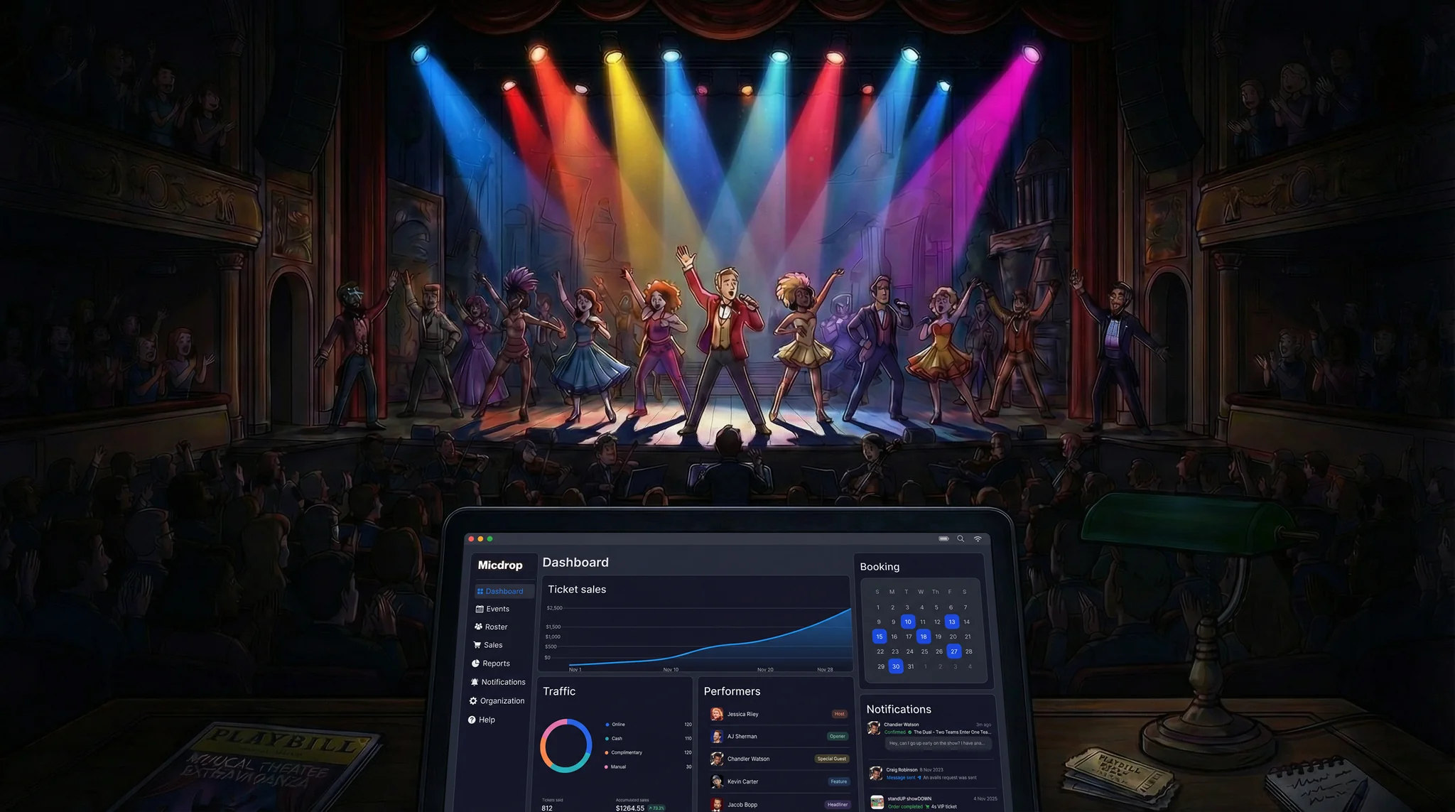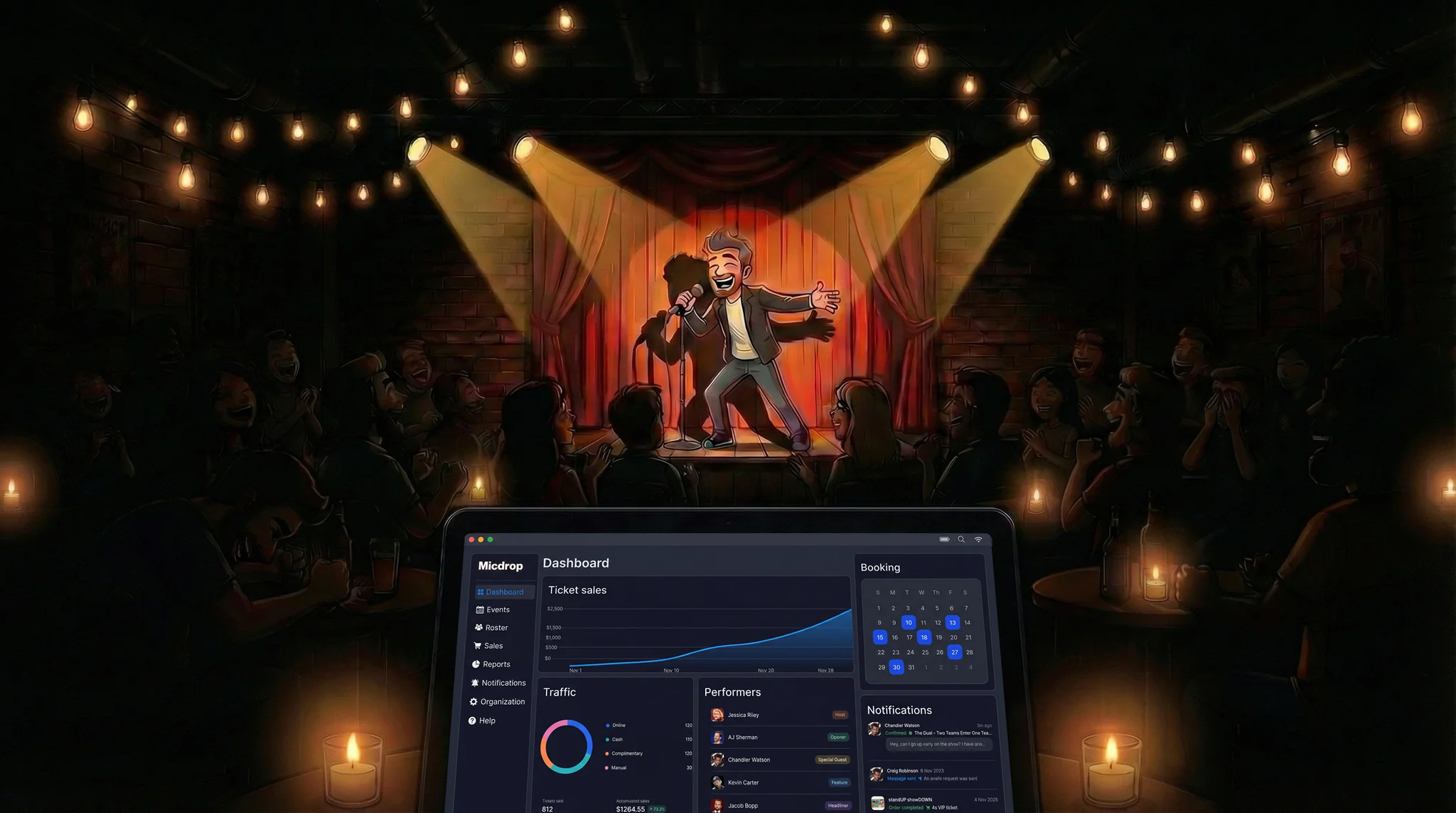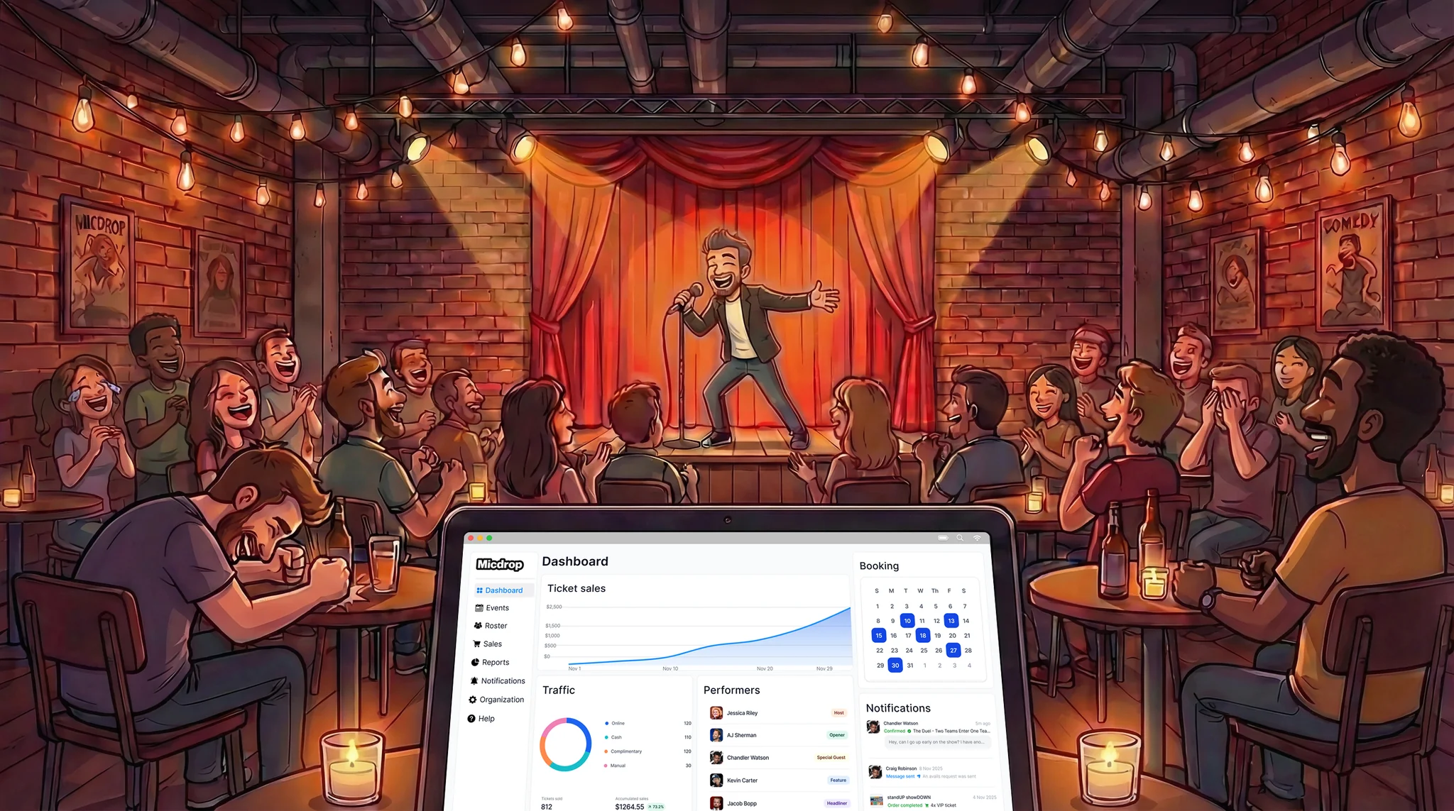 Your current system takes you forever to create, book, promote, and sell your shows. Chasing performers across emails, texts, and social messages is a hassle. Writing promotional posts over and over is a full-time job. Building ticket pages is a repetitive time-waster. Micdrop simplifies the whole process into one smooth workflow.
